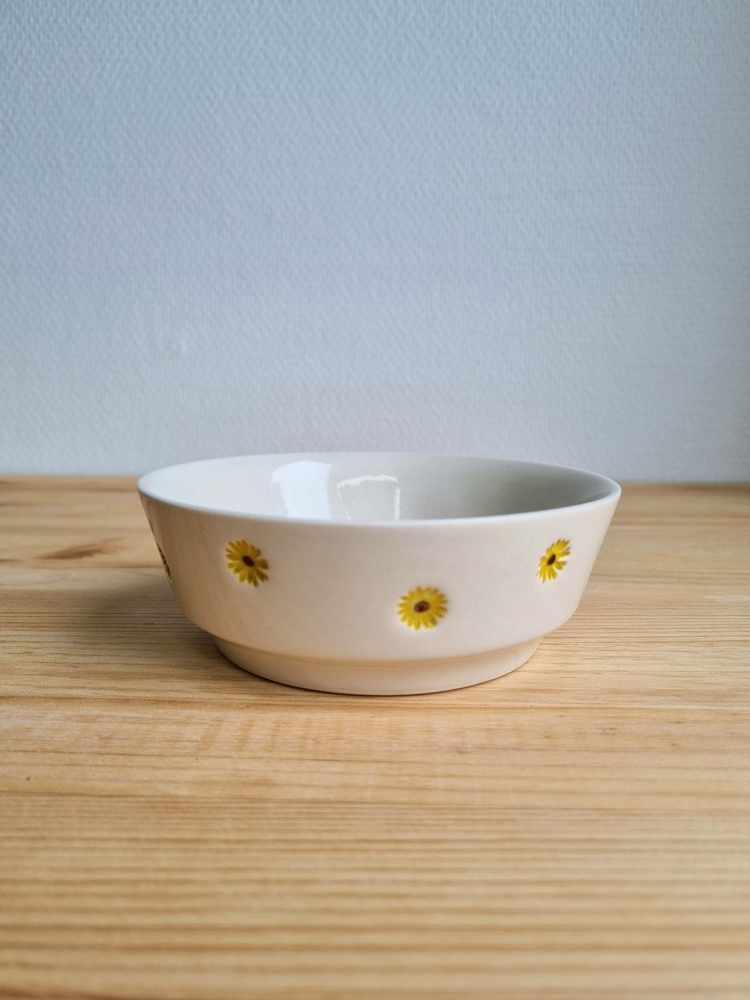 Skab solskin på bordet med denne smukke keramikskål med solsikker. Skålen er lavet i stentøj og dekoreret med en prydelig solsikke, der også er præget i bunden som en fin, lille detalje.
